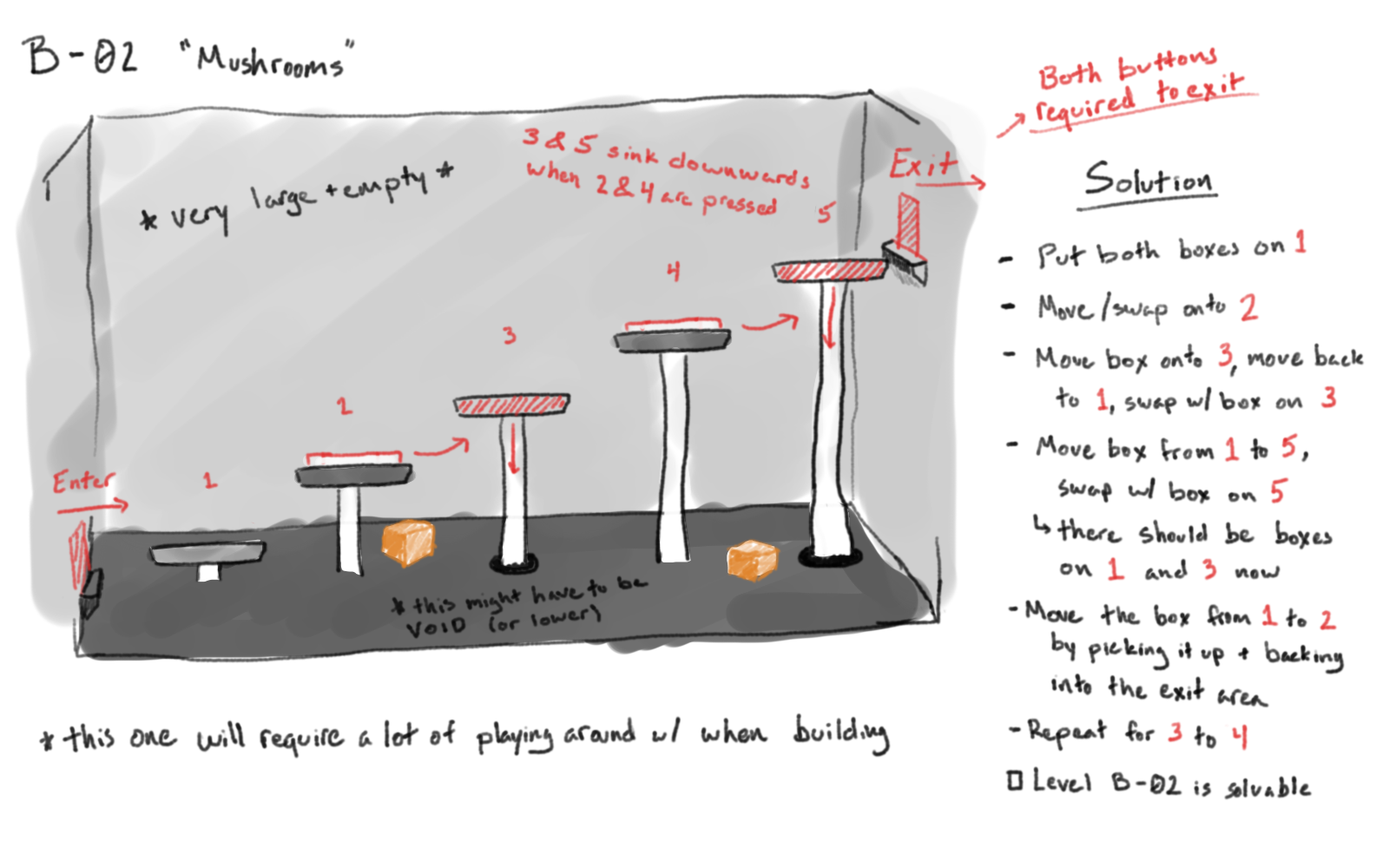 I focused on puzzle and level design in this project. I made a lot of level sketches, prototyped, gray boxed, and further tested all my levels. This was my first time designing 3D levels, so I did a bit of research on first person considerations. I also spent the most time on puzzle design. I brainstormed a lot and over several weeks when creating puzzles, taking advantage of the random shower puzzle inspiration when it struck. I'm happy with the levels I made (sketches below), and the lessons I learned about drawing out levels to show to others. I also learned a lot about the puzzle process involving the players strength (wanting a weak player), going deep with mechanics rather than wide with several mechanics, and the pains of avoiding cheese when developing puzzles.